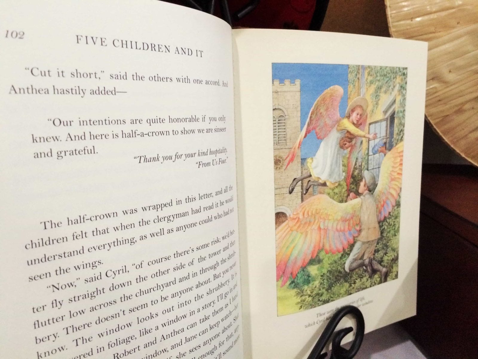 “Oh.” Suddenly Robin took the book from her lap and thrust it into my hands. “Here,” she said. “It’s a gift for you.” | It was “The Phoenix and the Carpet” by E. Nesbit. -p. 197