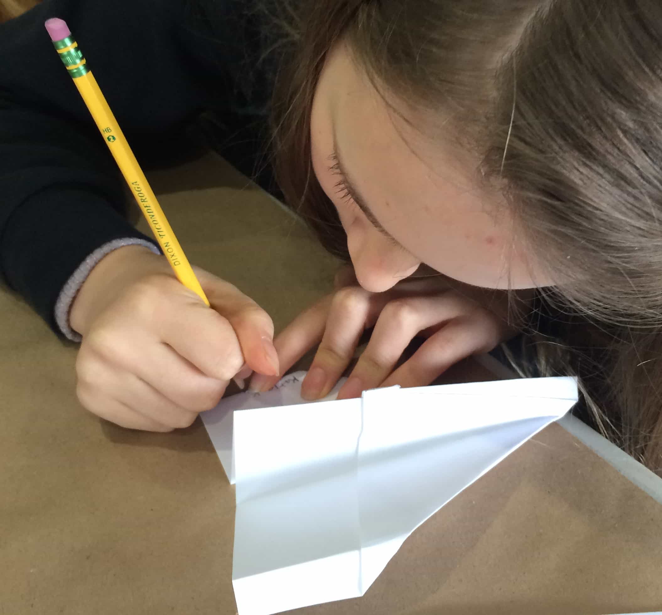 7. Add the tail. Cut a length of red ribbon or lightweight emergency tape about 1.5x the length of the kite, and tape it to the bottom point. This will be the tail — like the one Windrider attached to the glider at the beach. Write Lefty’s poem (or your own, from the creative writing worksheet) on the tail.
