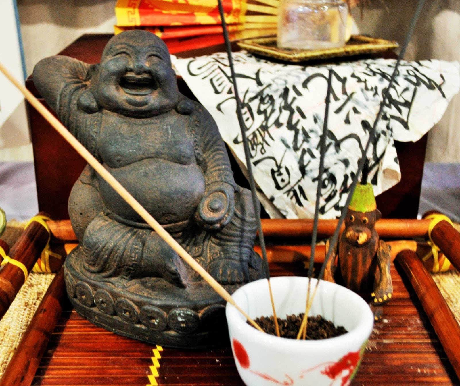 There were presents, of course. White Deer gave us a little statue of the Buddha-to-be, a happy, laughing god... -p. 92 | [On Polk Street the]first thing [Father] did was to put up a shelf. Then he set Monkey and the Buddha-to-be on it. He placed the cup of soil before them and stuck some incense sticks into the soil and lit them . . . -p. 99