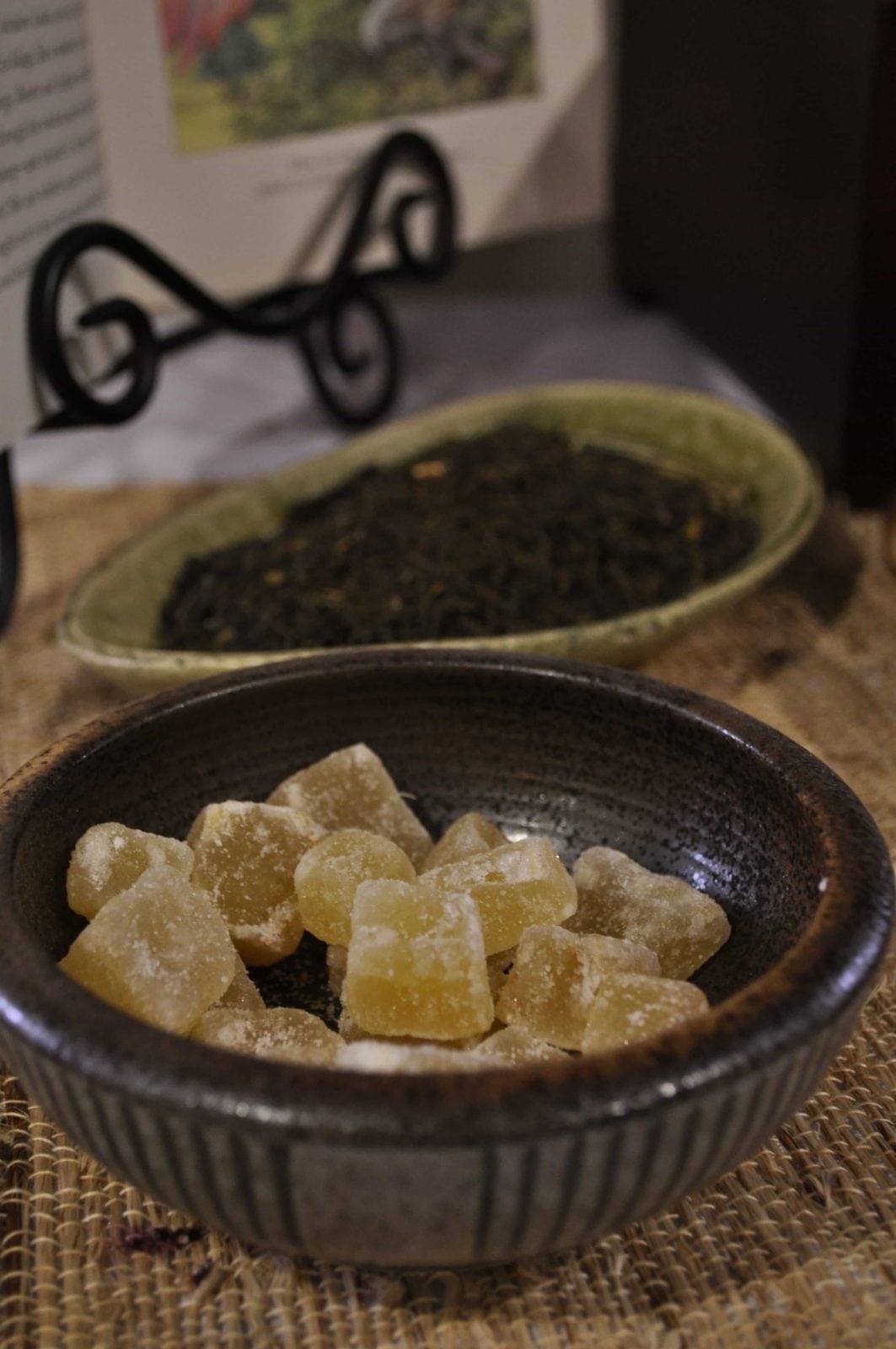 There were men in long narrow stalls set against the sides of buildings who sold toys and different candies— one a type of sweet but hot-tasting, candied ginger that was a bright orange-red in color. -p. 20 (We couldn't find bright red ginger.)
