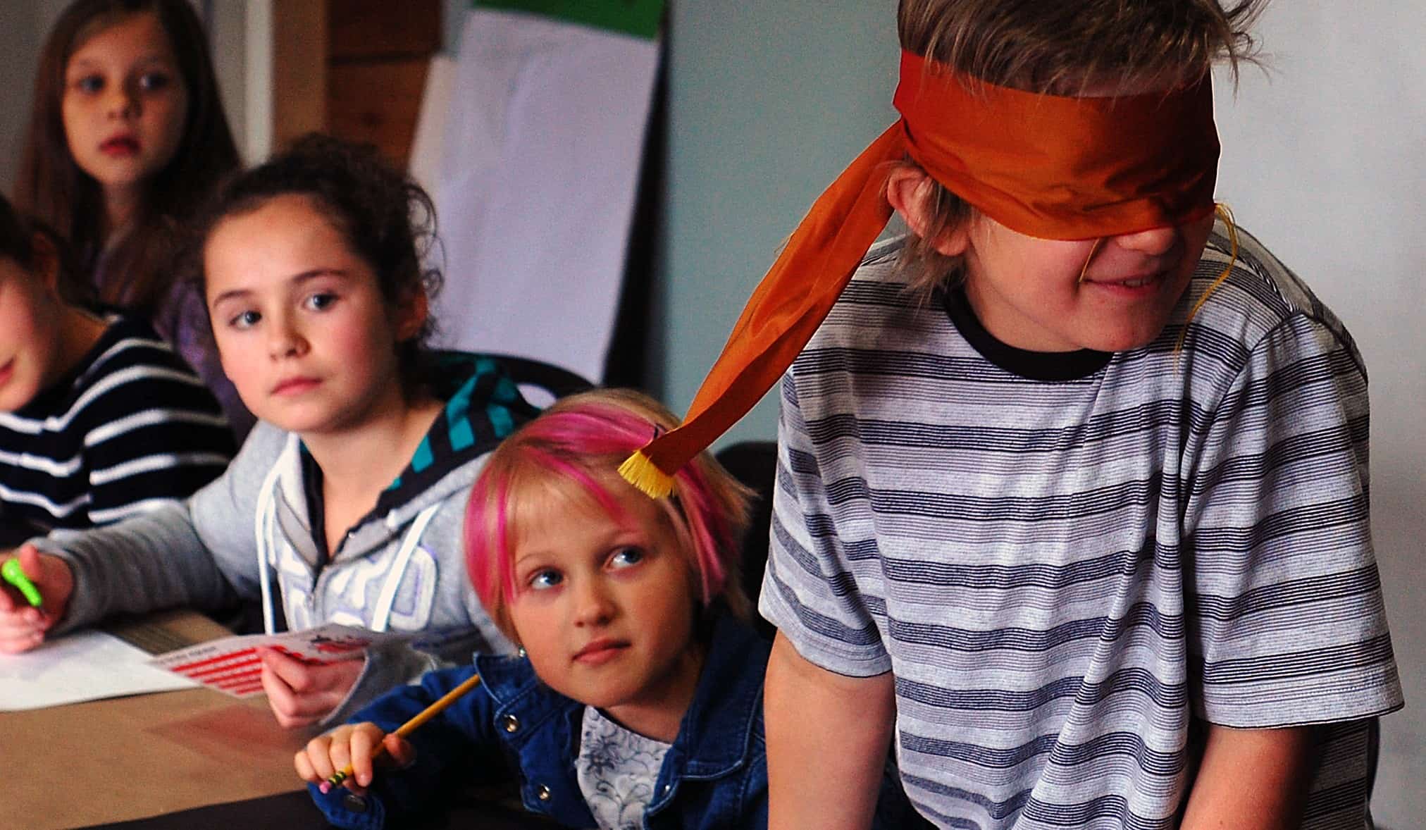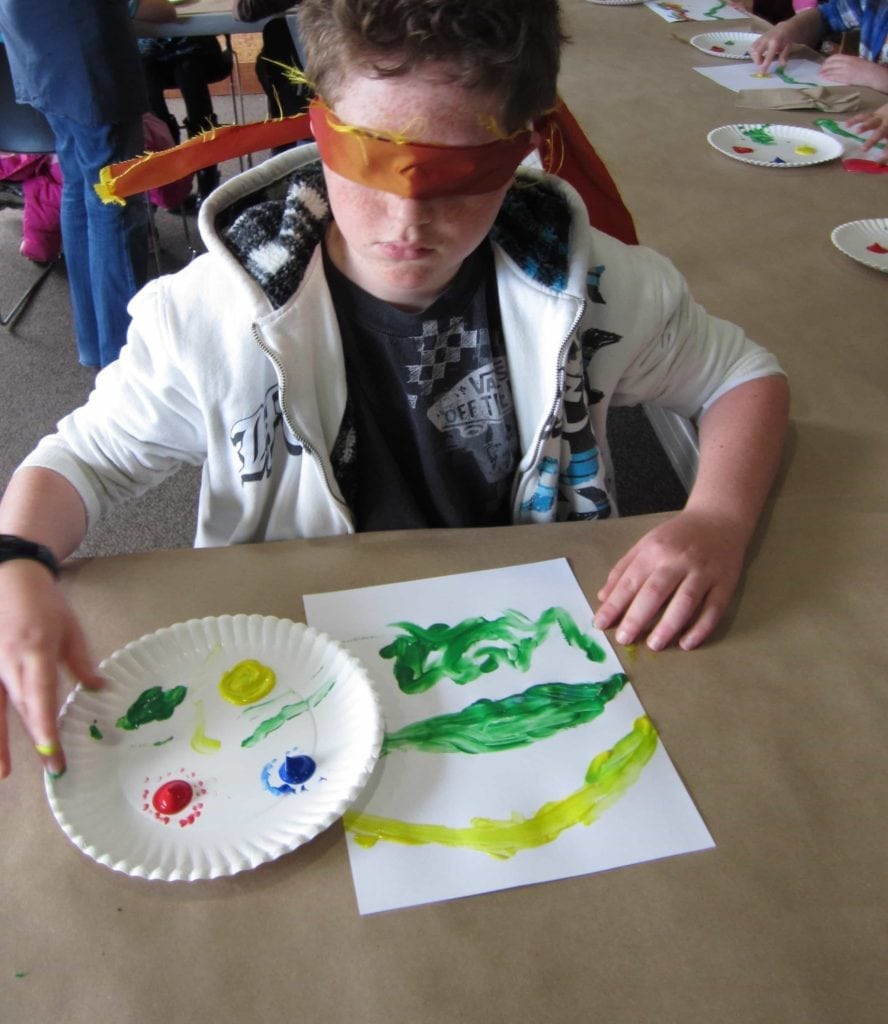 Blindfold the kids and read, or at least talk about, the scene from Chapter 9 in which Miss Young teaches Jimmy to visualize his dinner plate as the face of a clock, with his carrots from two to four o’clock, meat at six o’clock, string beans at twelve o’clock, etc. Tell them they will each receive a plate as well, but theirs will have paint on it instead of food.