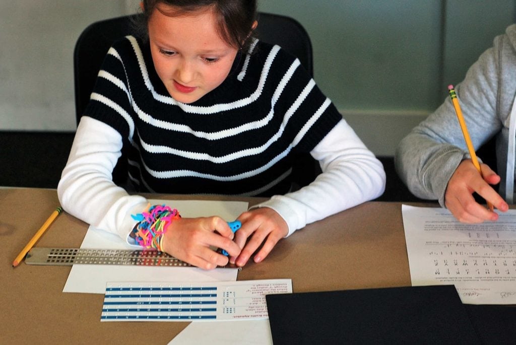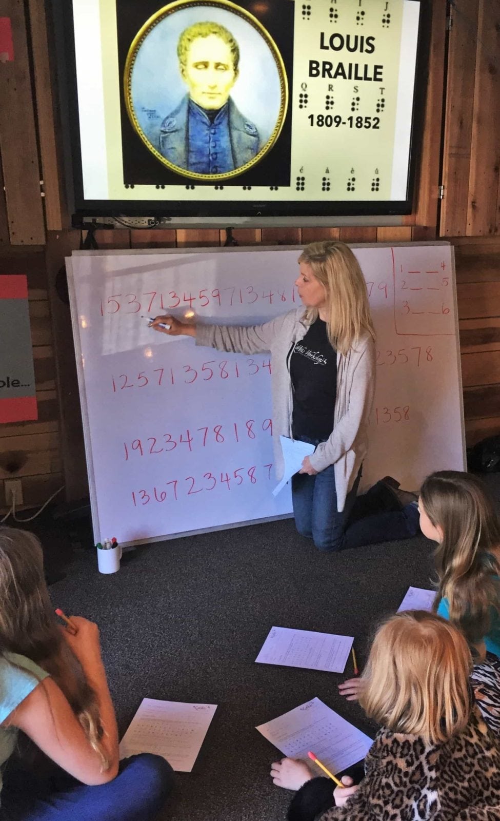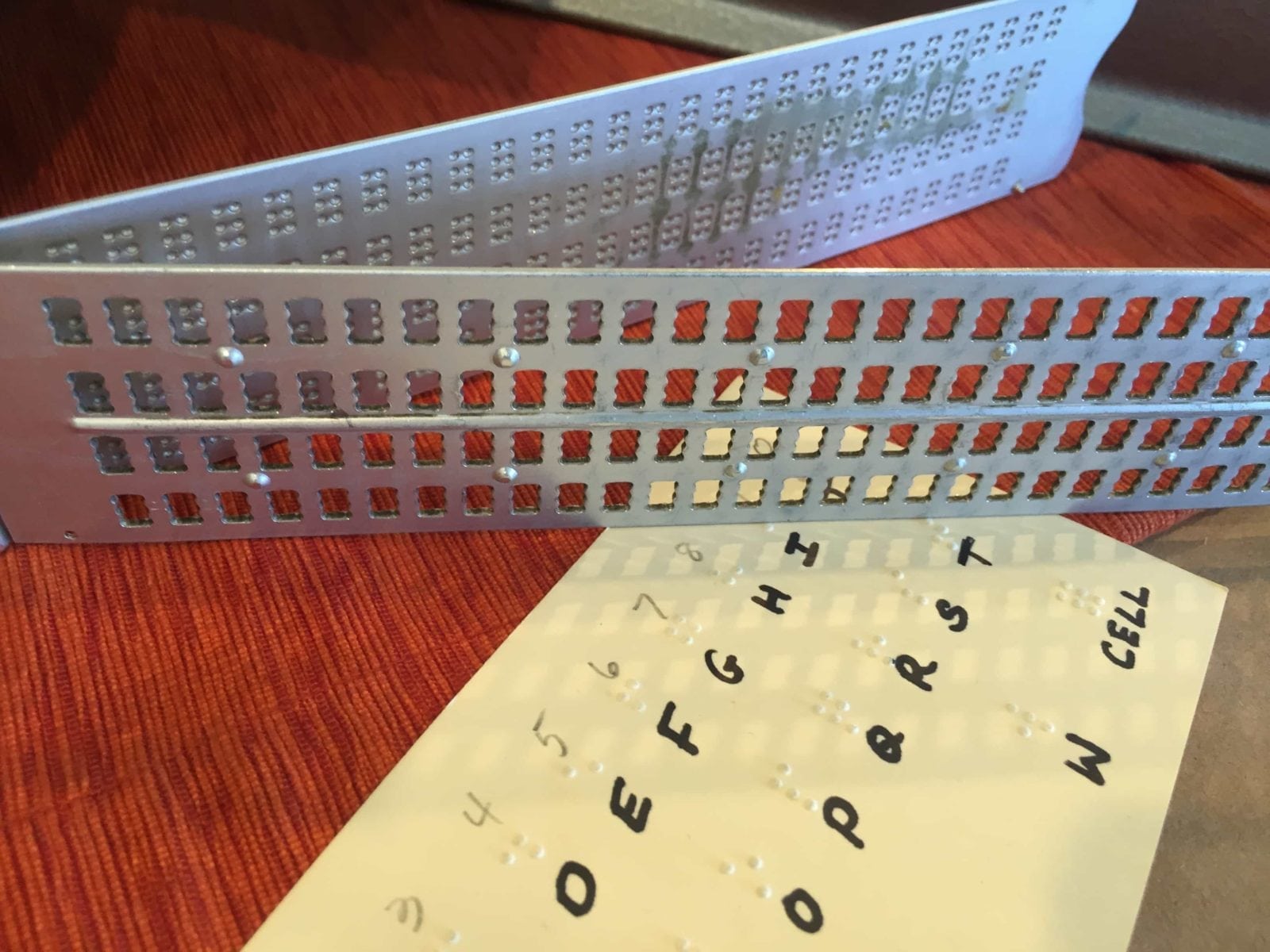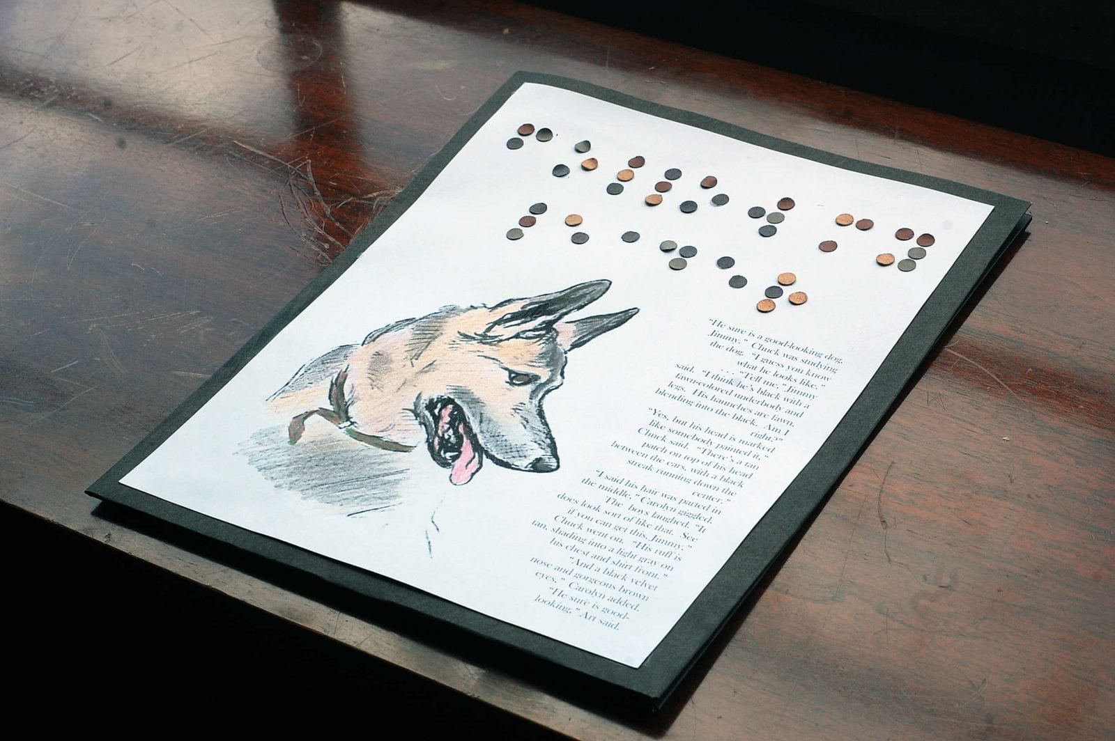 Braille is not only functional, it also has a beautiful, artistic quality to it. The same could be said for Jimmy’s guide dog, Leader! For this project we created an enlarged Braille version of the book’s title, and then colored in Leader’s portrait, using the description given by Jimmy’s friends in the book.