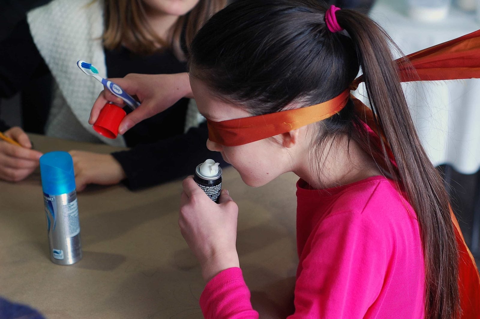Then the blindfolded child got to remove the blindfold, see if imagination and description matched up, and switch roles with their partner. Then all the kids got to rename their dogs as they pleased.