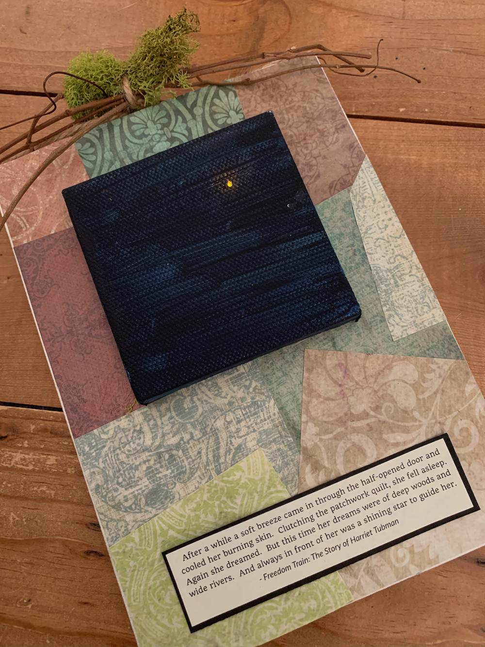 Project elements include the special quilt that covered her that night, and the North Star and woods that Harriet dreamed of. The moss of the woods also represents north, and the grapevine of the woods also stands for her people's message system. It's what we call a fully loaded project! Click open "What this represents," below, to discover the source and meaning of all its layers.