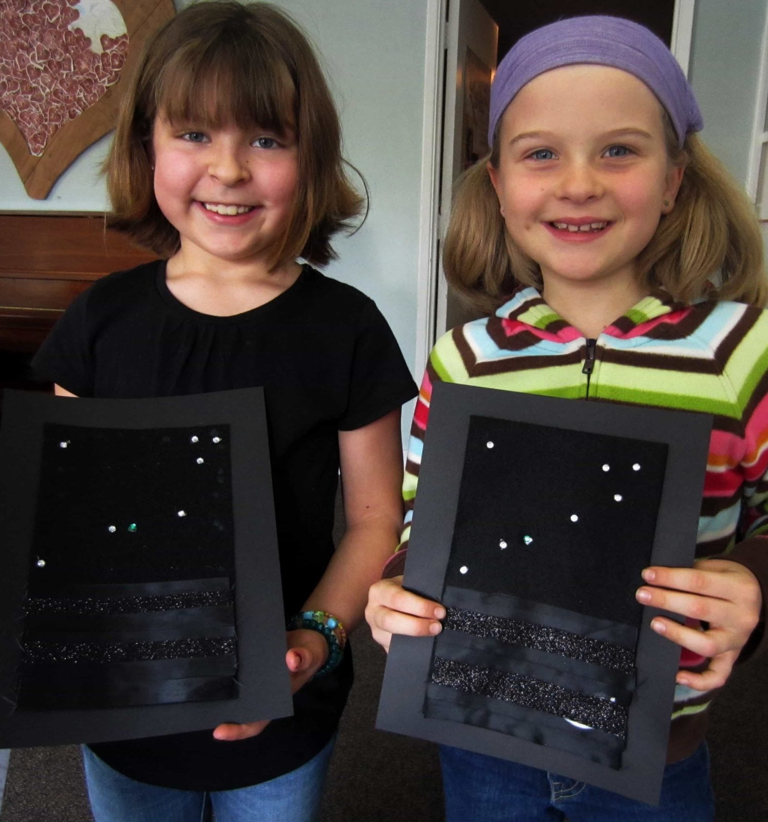 This project draws us closely into that beautiful, important scene in the story. There isn't a lot of color in it; in fact, it's mono-chromatic. Does anyone know what that means? (It means it's all made up of one color.) Karana says that there was "no difference between the sky and the sea"--yet she could tell which was which. Why? (Because the water reflected the light that shone from the stars.) The sky is soft and black, the stars are bright and clear, the sea is shiny and reflective. We're going to represent that scene in an art piece that lets us think about what that moment would have been like, and learn a little bit about astronomy and navigation, too.