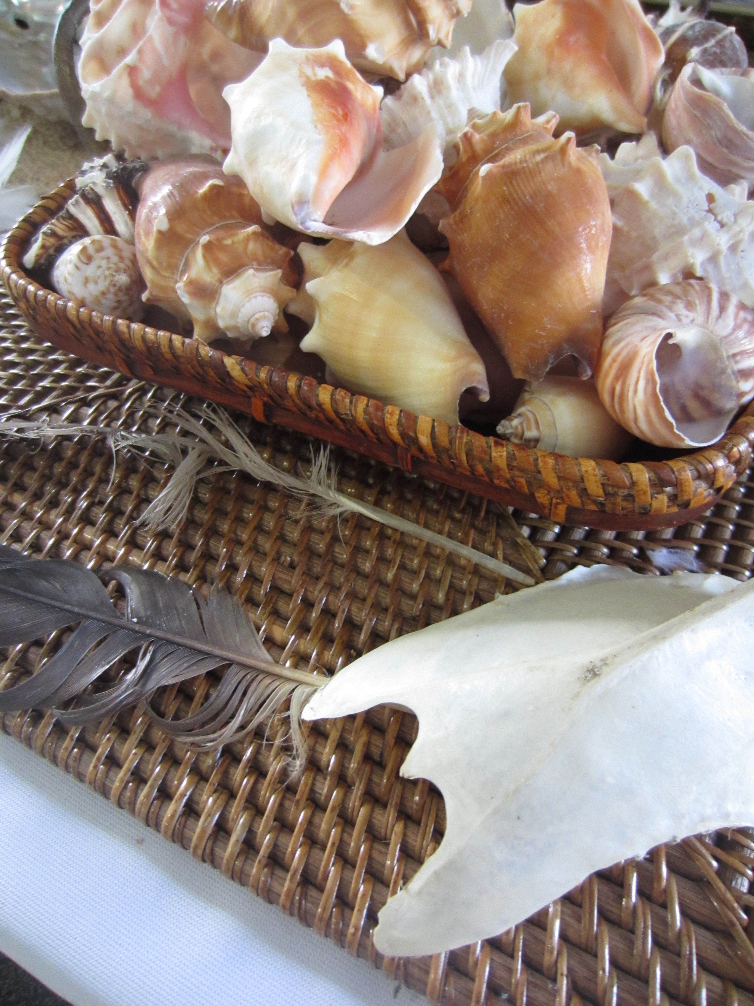 Attach the shells to the sinew (in the order of your choice) by folding the sinew in half first, then threading the ends through each shell from opposite directions and knotting the sinew in between each shell.