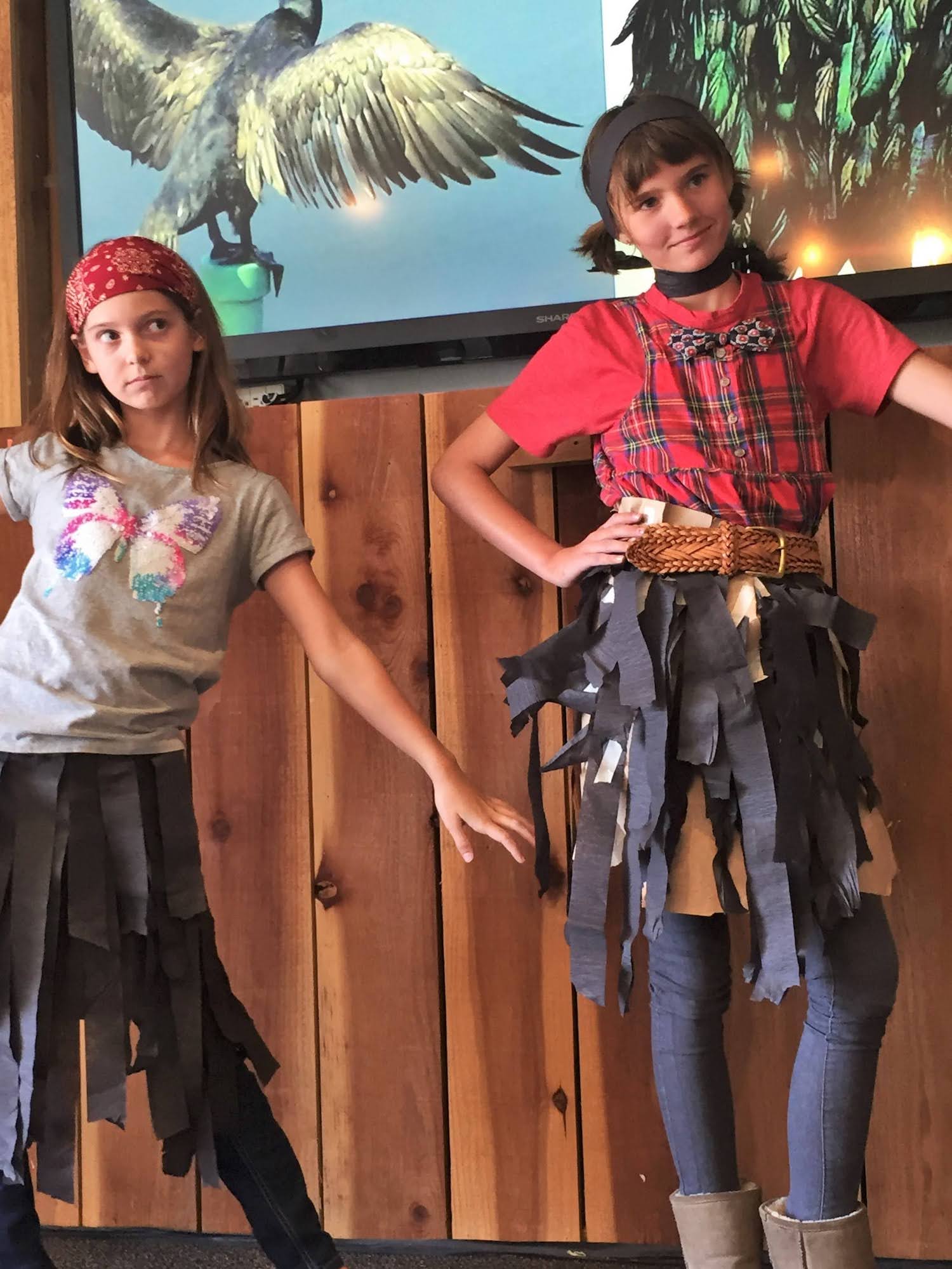 This activity emulates and emphasizes Karana's ability to make the most of what she had on hand. While we didn't want the kids to make an actual feather-skirt, for many reasons, we did want to honor her resourcefulness, ingenuity, and desire for beauty. So we had our kids design their own skirts in teams, giving each team 15 minutes to dress their model using black crepe paper, masking tape, and whatever they could grab from a pile of belts, ties, sashes, and other waistband materials.