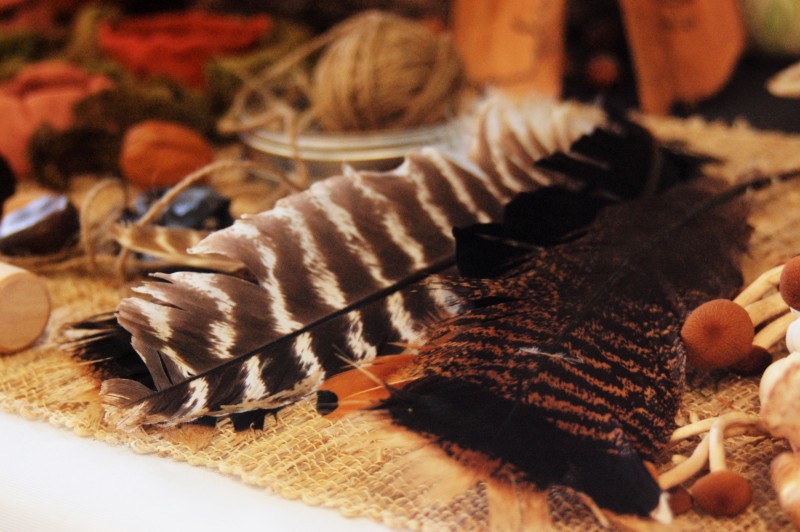 Tie a simple knot in the very end of the long leather lace (leash). Before tightening it completely, tuck the bottom end of the feather into the knot, for decoration. Then finish tightening.