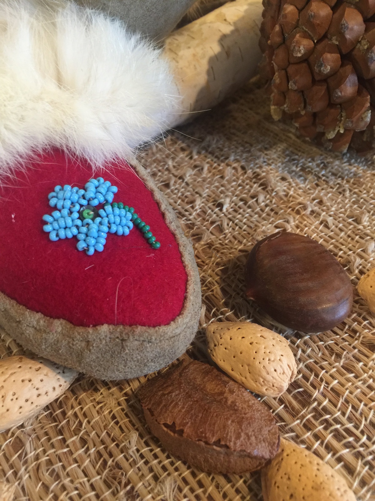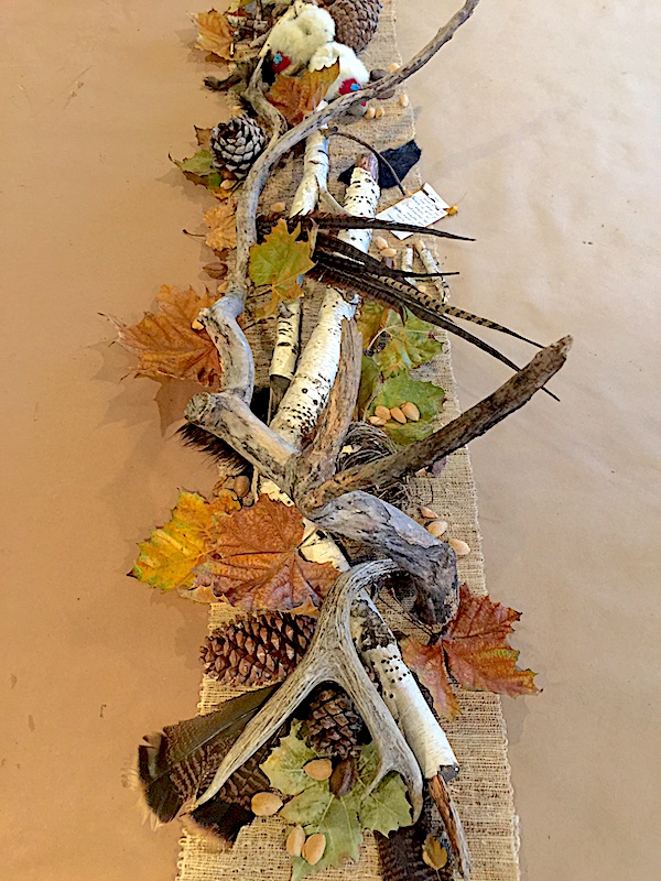 Below is an overview of the "forest foliage and feathers" display we put together for our live workshop, along with some close-ups of straight-from-the-story props. You could easily have your kids contribute items to a table over time, as the book is being read.