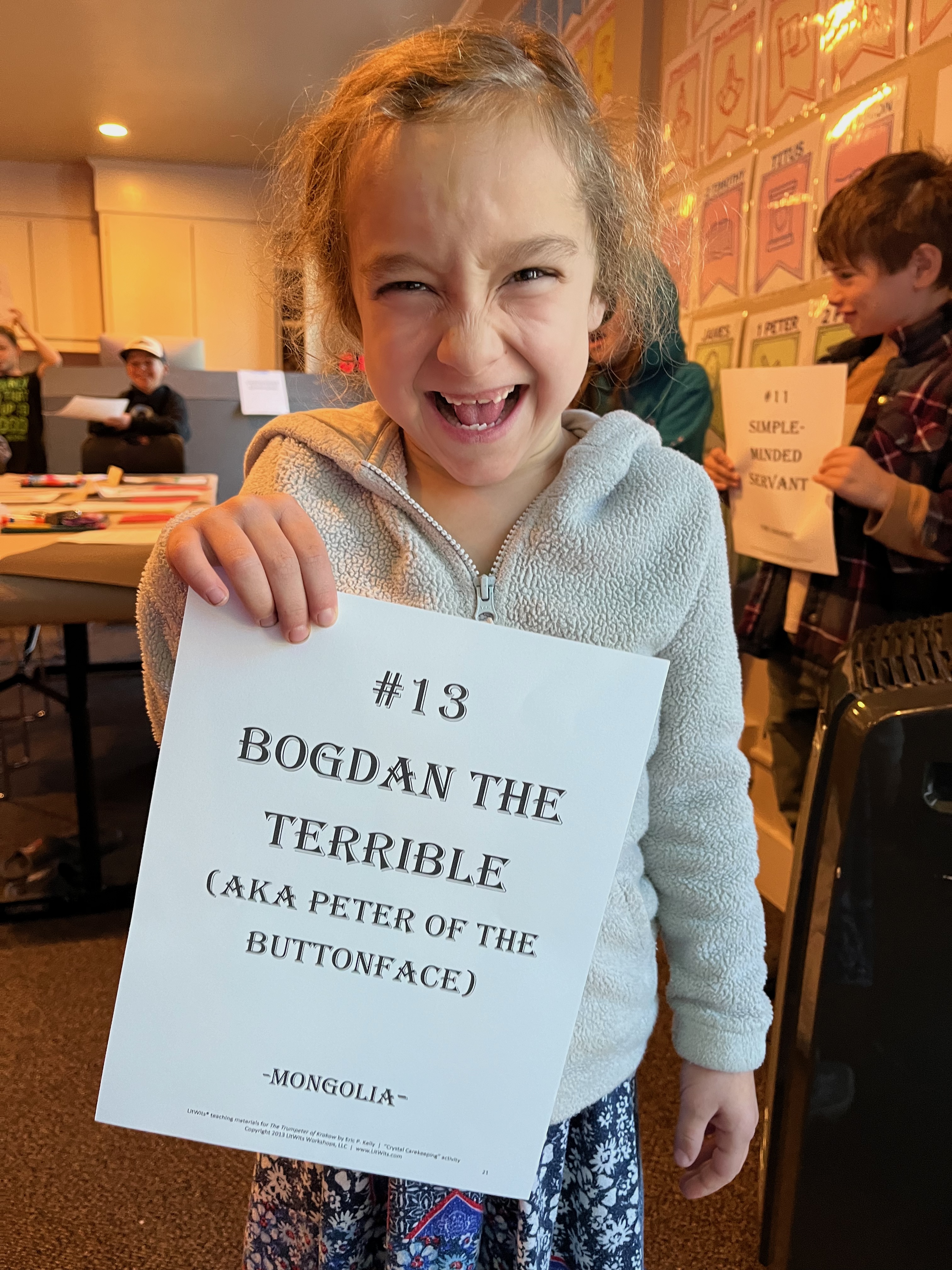 The Great Tarnov Crystal has a thrilling history, and it's a lot of fun to reenact its saga (as told in Chapter 15 by Bogdan the Terrible). And it’s a chance for kids to pick up a little geography, too! Following your prompts, they'll sneak the crystal from person to person, hamming it up as each character all throughout Europe. For instance: